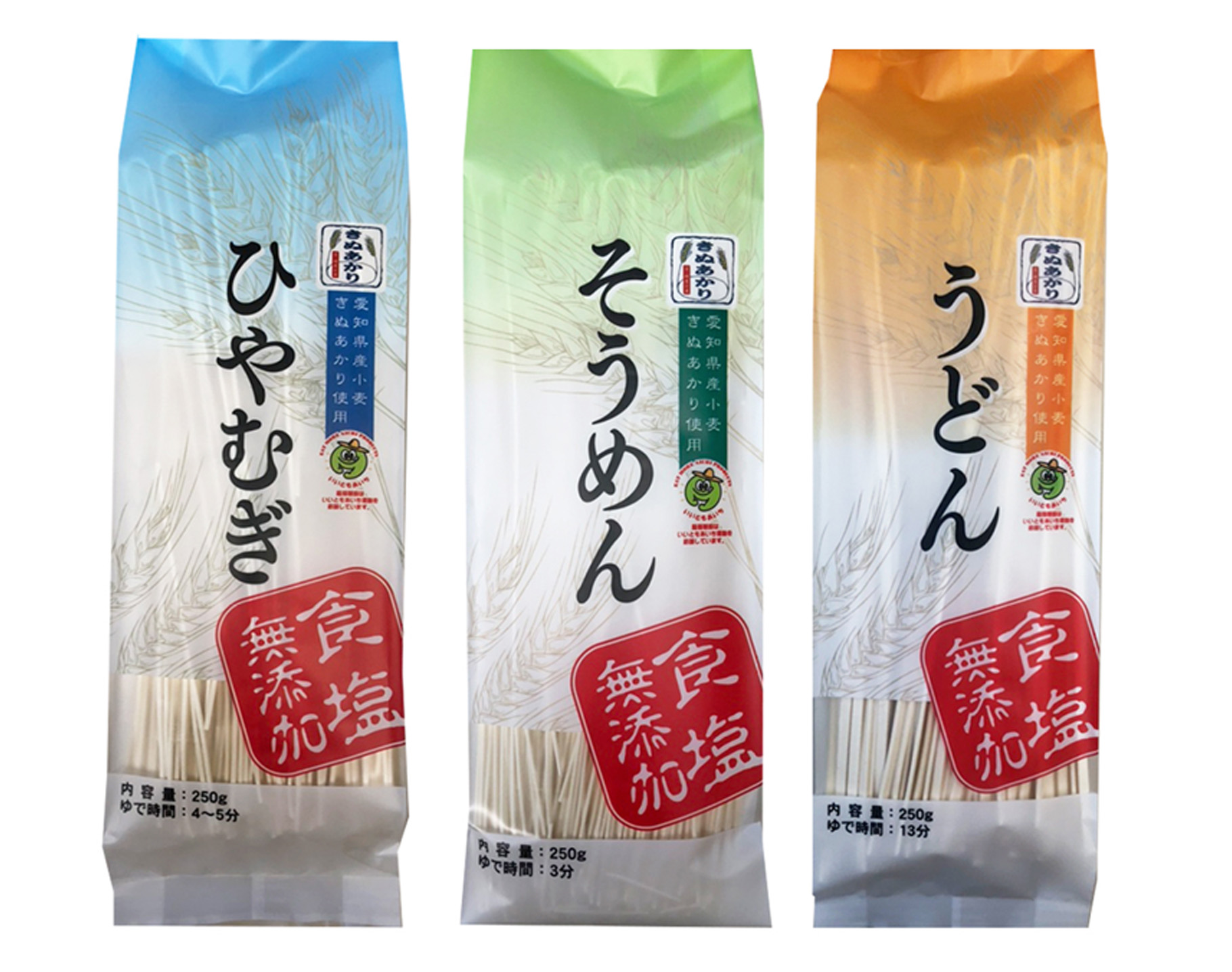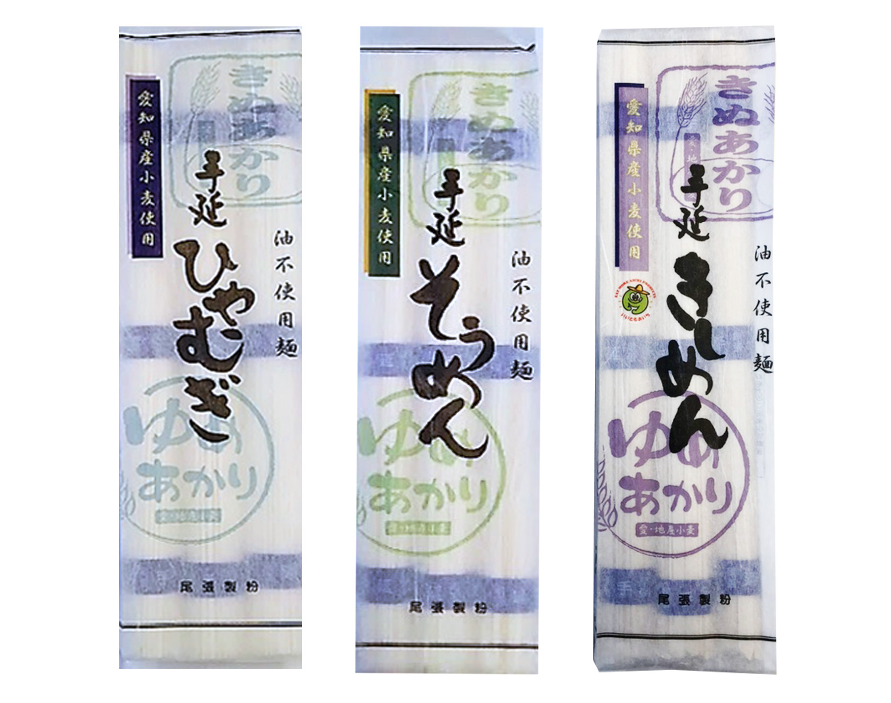 製法は通常の尾張手延べ麺と同じで、 愛知県産小麦ゆめあかりときぬあかりを使用した商品になります。